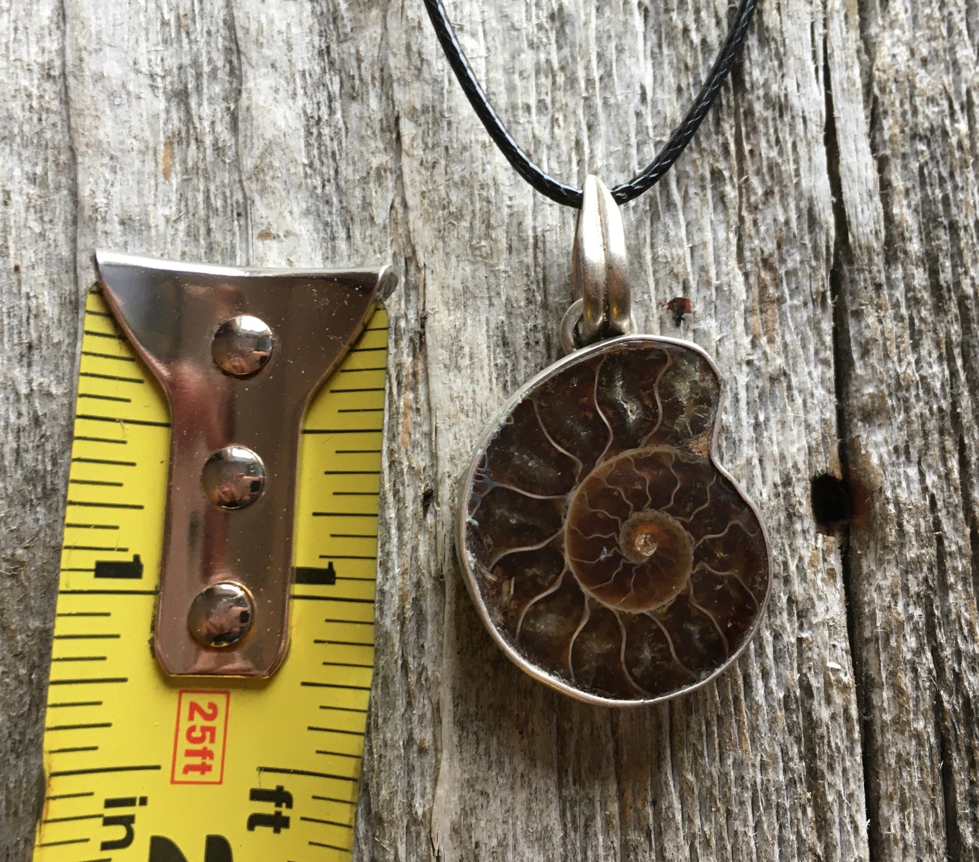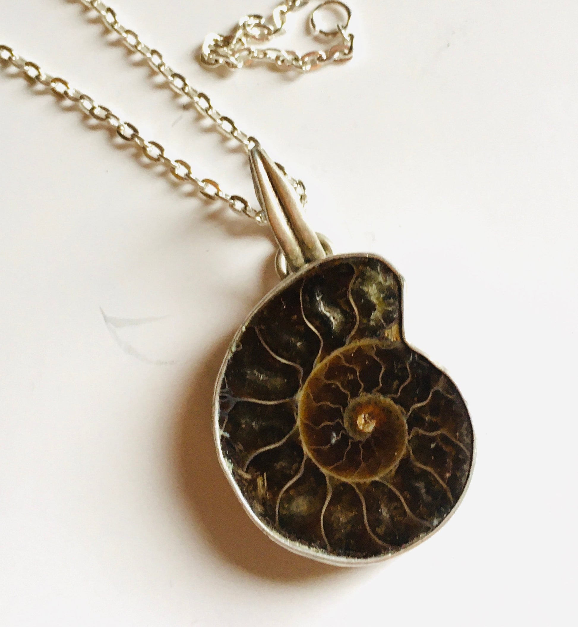 Ammonite pendant, featuring a stunning fossil in 92.5 stamped silver, comes with a silver-plated chain and gift-wrapped. Perfect as a treat for yourself or a gift for someone special.