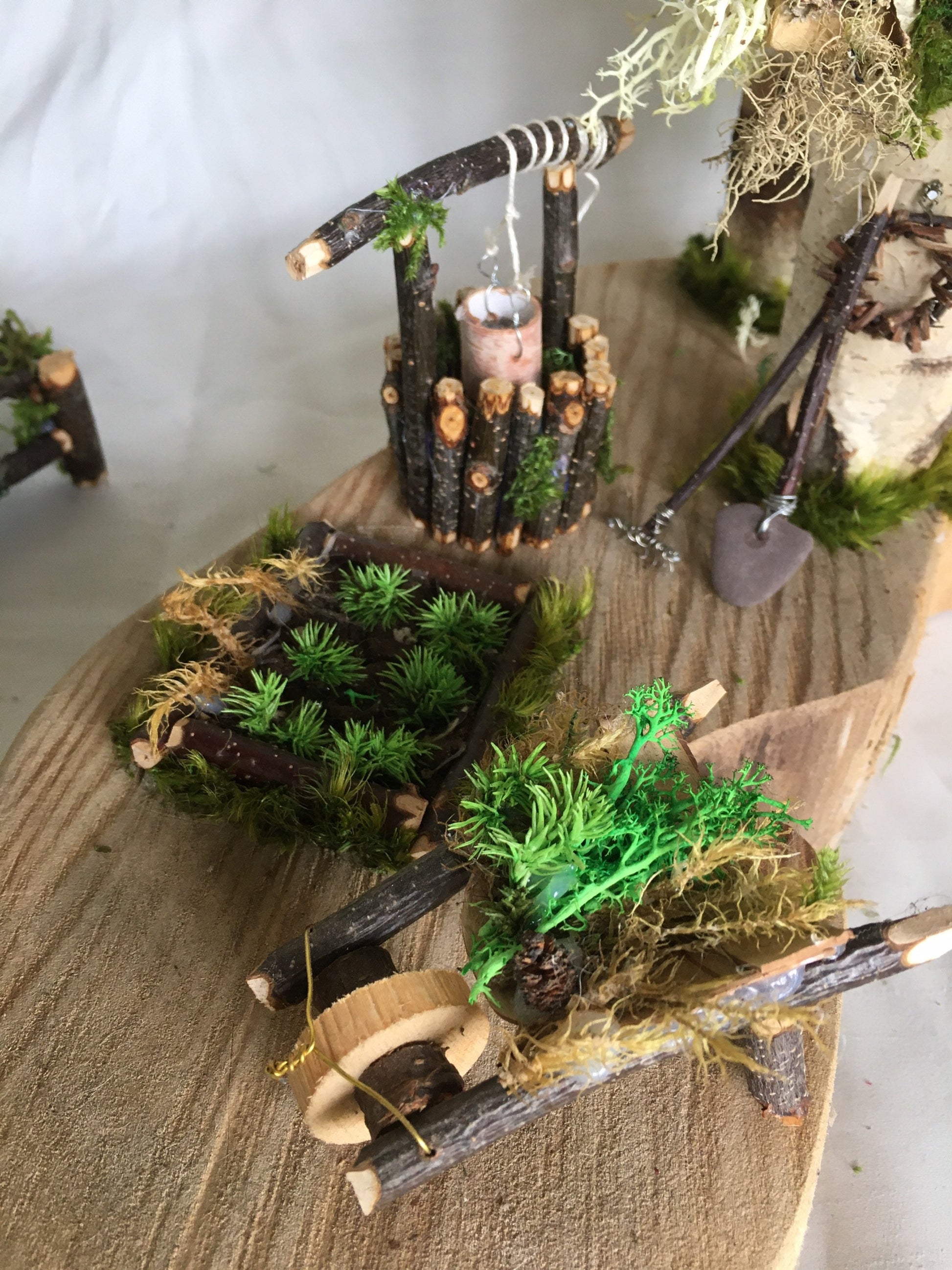 Fairy Garden set, includes; bench, stool, wheelbarrow, garden, spade, rake, Fae decor, whimsical fairy set